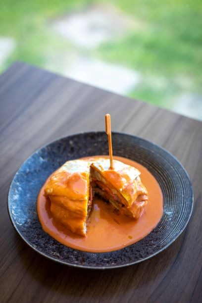 Francesinha suculenta no pão típico do caco, com um molho especial.